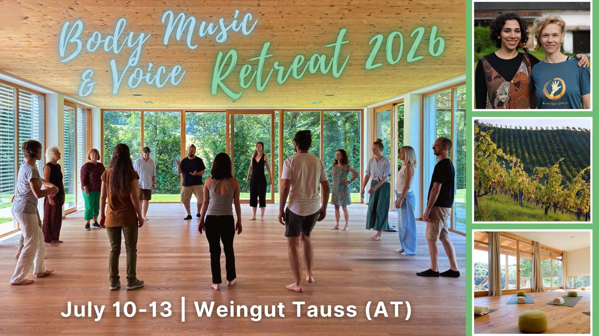 Vier Tage gefüllt mit Rhythmen und Liedern aus unterschiedlichen Kulturen, mit Melodien, Singen in der Natur, gemeinsamem Grooven, Stimmbildung, Rhythmusspielen, körperlichen Warm-ups, musikalischem Training, Improvisationen, Circle Singing und mehr. In der inspirierenden Umgebung der Südsteirischen Weinberge bieten wir dir eine einzigartige musikalische Erfahrung in einem tollen Seminarhotel mit wunderbarem Setting.